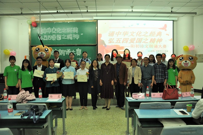 本网讯(文、图/罗祺平)为传承经典文化,弘扬五四精神,营造健康积极的文化氛围,5月14晚七点,由党委学生工作部、教科学院主办,教科党建中心、传媒中心和教科易班分站承办的"诵中华文化之经典,弘五四爱国之精神”主题"阳初"诗文朗诵比赛的决赛在行知楼314教室如期举行。全校十五学院的学生代表参与决赛,评委由关工委老教授敖良义、体育学院党总支书记钟英、学生处副处长丁敏娜、四川省普通话测试员翟雅媛以及学生处易班负责人强光平组成。教科学院党总支书记杨霞、副书记张波参加了朗诵会。
