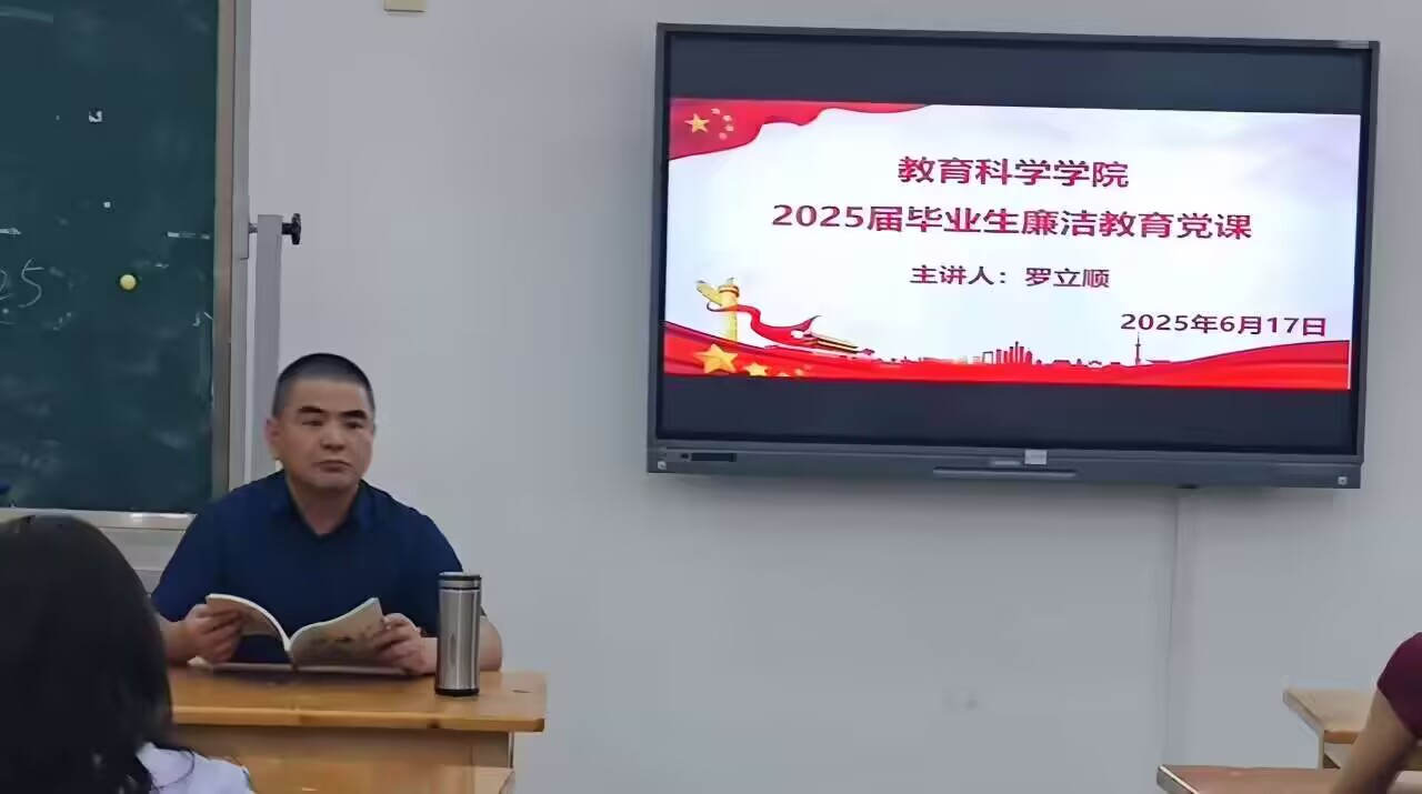 本网讯(文、图/张源元)6月17日下午,教育科学学院在学院会议室举行2025届毕业生座谈会暨廉洁教育专题党课,学院毕业生党员和班团干部参加。学院党委书记罗立顺以“廉洁从业守初心 青春担当践使命”为主题,结合案例剖析,为毕业生讲授“大学最后一课”,筑牢青年学子廉洁思想防线。