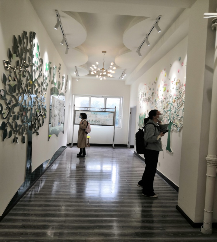 一进入活动中心,宽阔的大厅和一条长廊。长廊两边,一面粘贴满了学生们的祝福语,学校的照片,或是几幅画,还有些是家长致自己孩子的一封信……另一面则先是在书架上摆放了格式的书籍,末后,在树枝模样的贴画上又贴满了祝福语。心理健康中心主要给人的感受是安静,其次是舒适。偏绿色的布置和宽敞的空间给人一种安心的感觉。最后在走廊的尽头立了一块牌子,类似于公告栏,“情绪镜”字样显得格外醒目。顾名思义,公告栏上立满了四列情绪词,而在每个情绪词后的空白处,贴满了学生的小贴纸,代表着粘贴者的情绪。