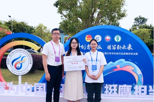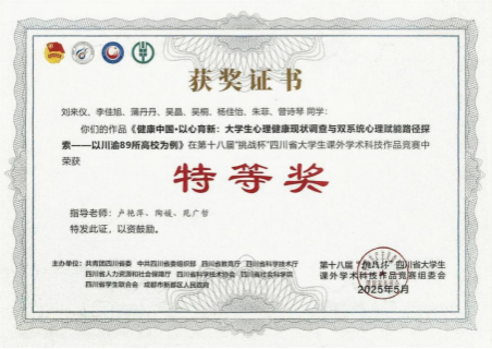 本网讯(文、图/刘来仪)2025 年 5 月 24 日至 26 日,第十八届 “挑战杯” 四川省大学生课外学术科技作品竞赛终审决赛在成都医学院举行。本届大赛吸引了四川省 121 所高校、18 万余名青年学生积极参与,共收到报送作品 2.2 万件,经过层层筛选,近 1400 件作品进入省赛初评,最终 505 件作品脱颖而出,成功晋级省赛终审决赛。我院由卢艳萍、陶媛、苑广哲老师指导,刘来仪、李佳旭、蒲丹丹、吴晶、吴桐、杨佳怡、朱菲、曾诗琴 8 位同学组成的“健康中国?以心育新”项目组荣获特等奖,刷新了学校在该项赛事省赛中的获奖记录。