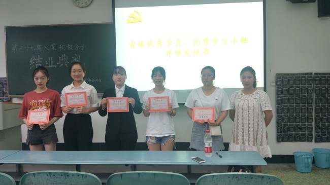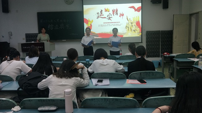 典礼开始,全体起立,奏响慷慨激昂的国歌。首先,分党校优秀学员李琪进行了发言,她表示,通过党校的学习,让她从思想上、作风上、行动上都有了突破与升华,坚定了自己要加入党组织的决心与信念;她承诺,在今后会继续脚踏实地向优秀党员学习,用党员标准严格要求自己,用实际行动接受党组织的考验。紧接着,魏逍宣布了本期入党积极分子顺利结业名单、优秀学员与优秀学习小组名单,并颁发了相关证书。