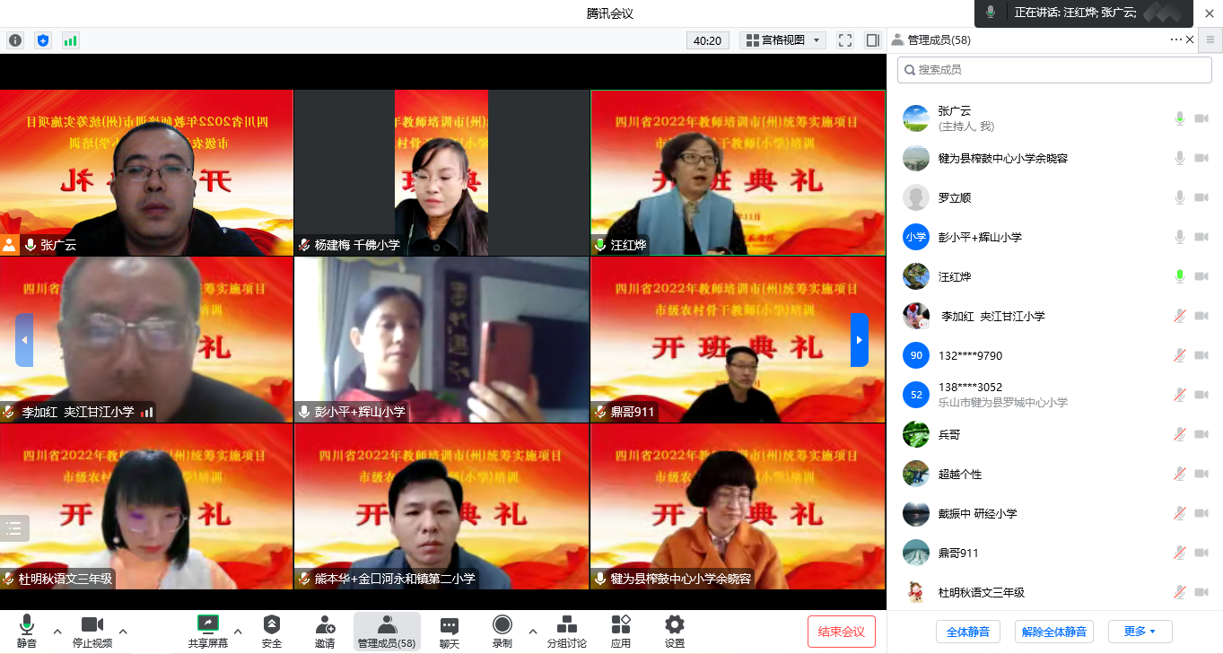 本网讯(文图/李巧玥)14日上午,由乐山ty8天游平台登录承办的四川省2022年教师培训市(州)统筹实施项目市级农村骨干小学教师培训开班典礼顺利开展。乐山ty8天游平台登录党委书记罗立顺、院长汪红烨、党委副书记兼纪委书记何晓军、副院长徐世鼎、唐前军,项目首席执行专家、教师教育公共课教研室主任张广云,班主任杨林、孙来成及乐山市各区、市(县)50名市级骨干班主任及骨干学科教师参加了此次典礼,开班仪式由徐世鼎主持。