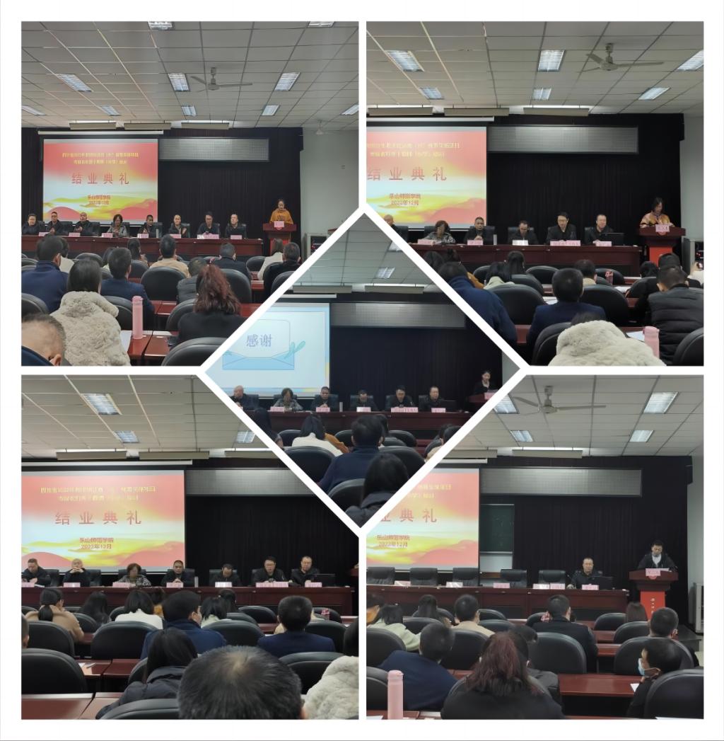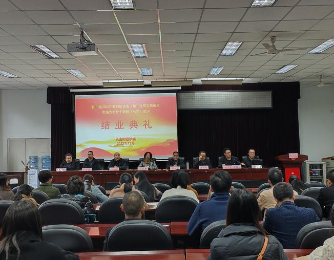 本网讯(文、图/张广云)12月1日上午,有乐山ty8天游平台登录承办的“四川省2022年教师培训市(州)统筹实施项目——农村骨干教师能力提升培训”线下结业典礼在弘毅楼413教室顺利进行。教育科学学院院长汪红烨,党委书记罗立顺,党委副书记和何晓军,副院长徐世鼎、唐前军及首席执行专家张广云、班主任孙来成、杨林和来自乐山市各区县的50名7年以上教龄的小学骨干教师参加了此次结业典礼,徐世鼎主持结业典礼。