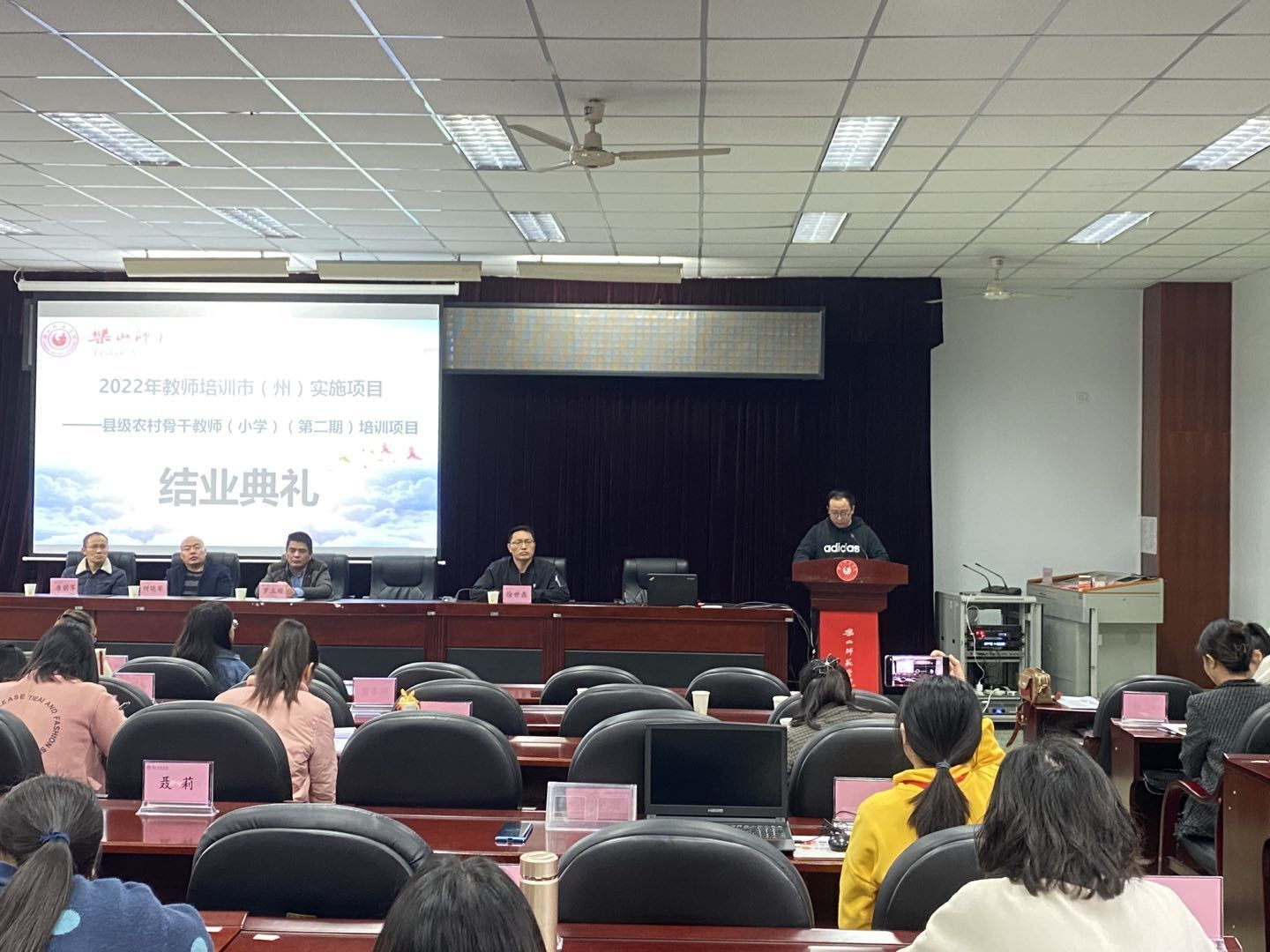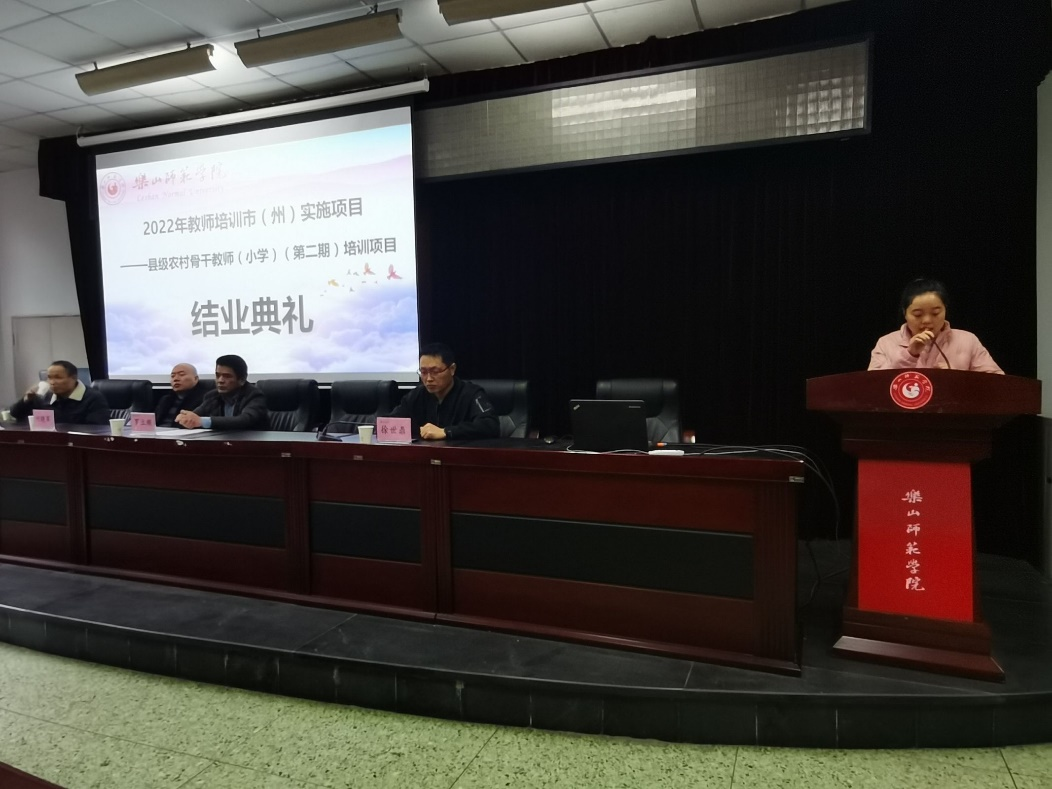 本网讯(文/冯紫君、图/雷仕美、缑月娇、蒲绍东)3月28日,2022年“国培项目”市(州)实施项目——县级农村骨干小学教师培训(第二期)结业典礼在弘毅楼413教室顺利举行。乐山ty8天游平台登录党委书记罗立顺、党委副书记兼纪委书记何晓军、副院长徐世鼎、唐前军、教学班主任廖娅晖及47名学员参加了结业典礼。结业典礼由徐世鼎主持。