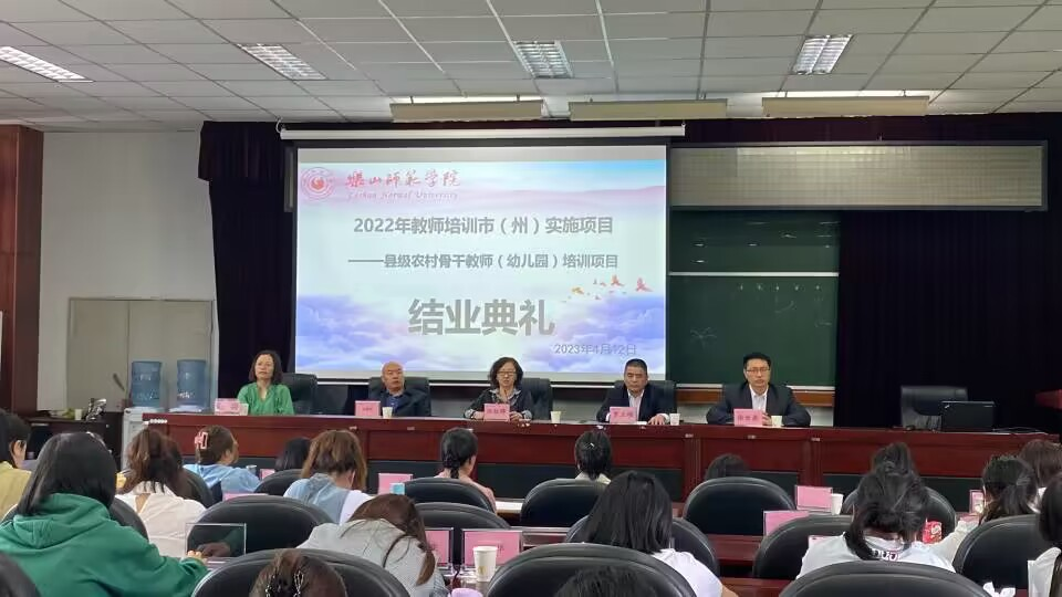 本网讯(文、图/王佳利、唐浩淇、游静姝)4月12日中午,由乐山ty8天游平台登录承办的四川省2022年中小学幼儿园教师培训市(州)实施项目——县级农村学前骨干教师培训结业典礼在弘毅楼413教室举行。乐山ty8天游平台登录院长汪红烨、党委书记罗立顺、党委副书记何晓军、副院长徐世鼎、培训班班主任刘涛以及50名培训学员共同参加了结业典礼。