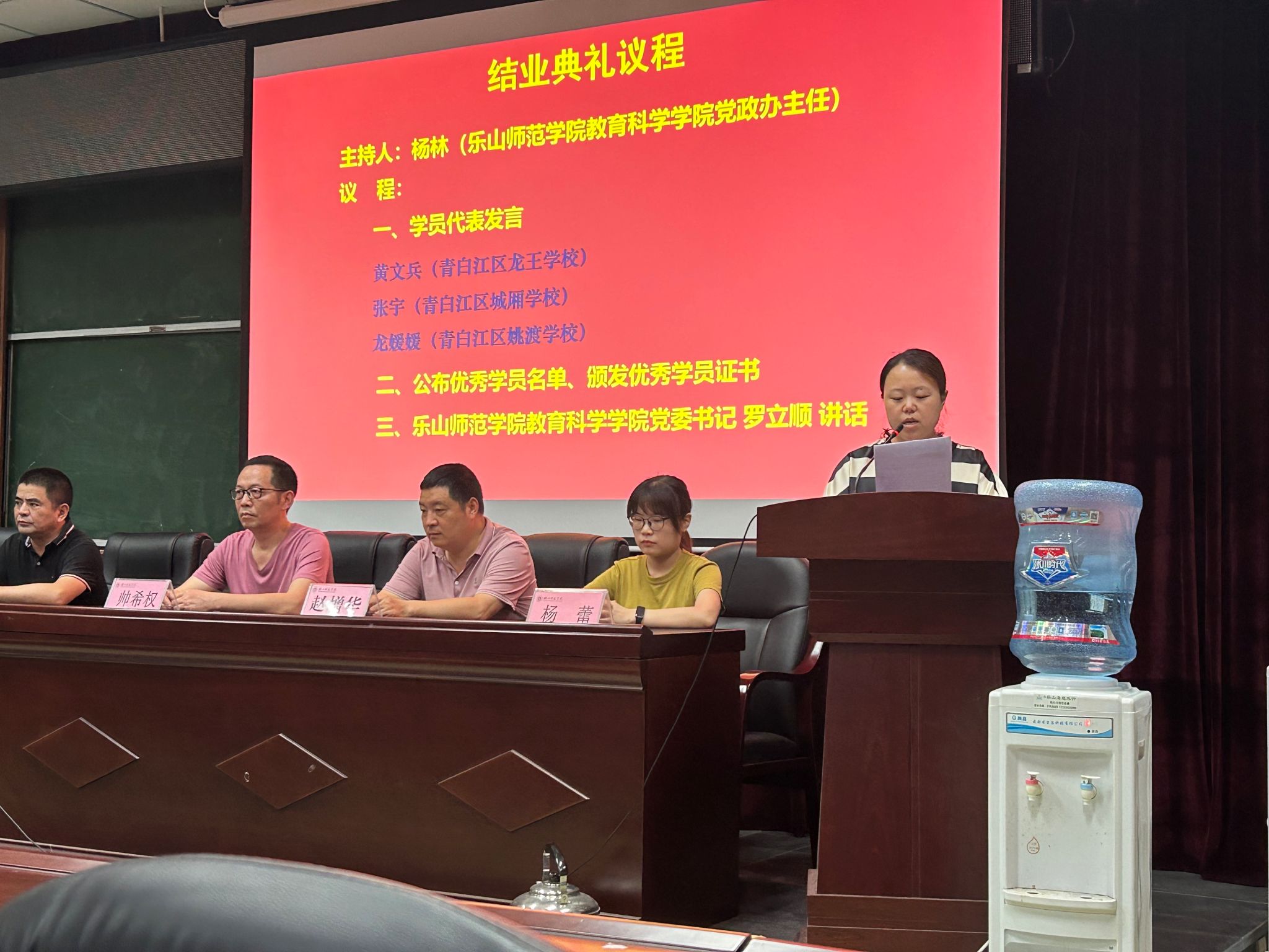 本网讯(文、图/李金婷)7月18日上午,由乐山ty8天游平台登录承办的“2024年成都市青白江区中小学教师班主任专业素养培训”结业典礼在弘毅楼412教室举行。教育科学学院党委书记罗立顺、教师教育教研室主任张广云、教务与科研管理办公室主任帅希权、实验科科长赵增华、辅导员杨蕾及81名学员参加结业典礼,由学院党政办主任杨林主持。