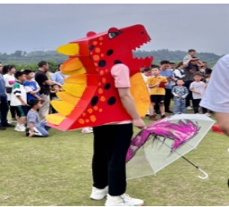 情景表演:学前教育专业的哥哥姐姐们和来自幼儿园的张锦宸小朋友精心策划和表演了音乐情景剧《勇战恶龙》。家长和小朋友们围圈观看,一条“恶龙”出现,小朋友们惊呼不已,跟随剧情发展,家长小朋友们明白定点投掷和移动投掷的游戏规则。