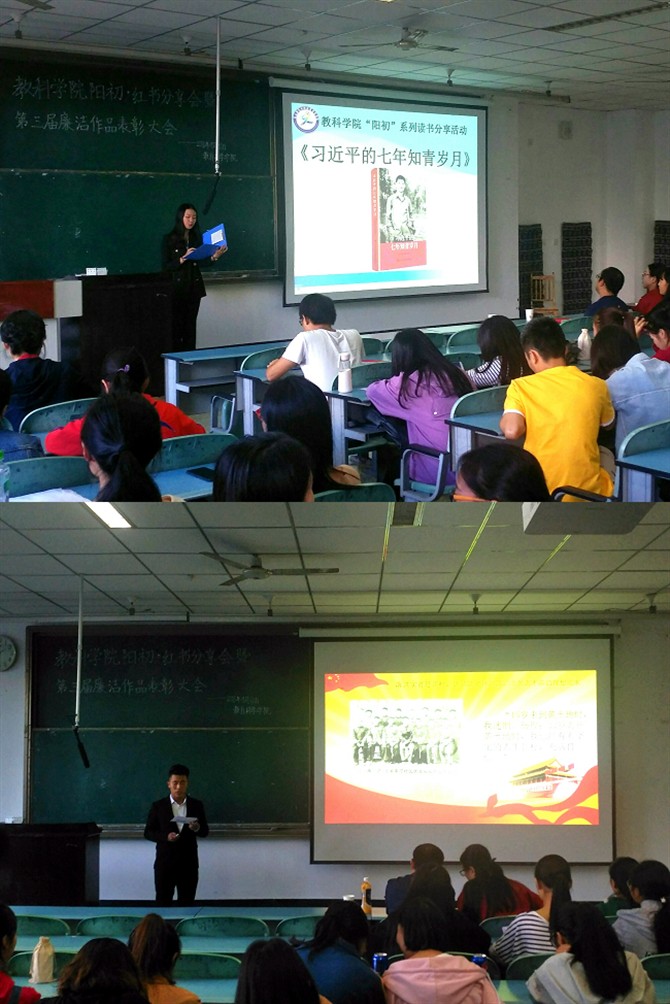 9月28日下午,为鼓舞我院学生做有时代担当的青年,教科学院党建中心在行知楼125教室举办“阳初”系列活动《习近平的七年知青岁月》读书分享会暨第三届廉洁文化作品颁奖仪式。宣传部副部长蒋政、教科学院党总支书记杨霞、辅导员袁立方老师、魏逍老师参加了本次活动,我院各班学生代表及文新学院、音乐学院和数信学院的学生代表参加了本次活动。