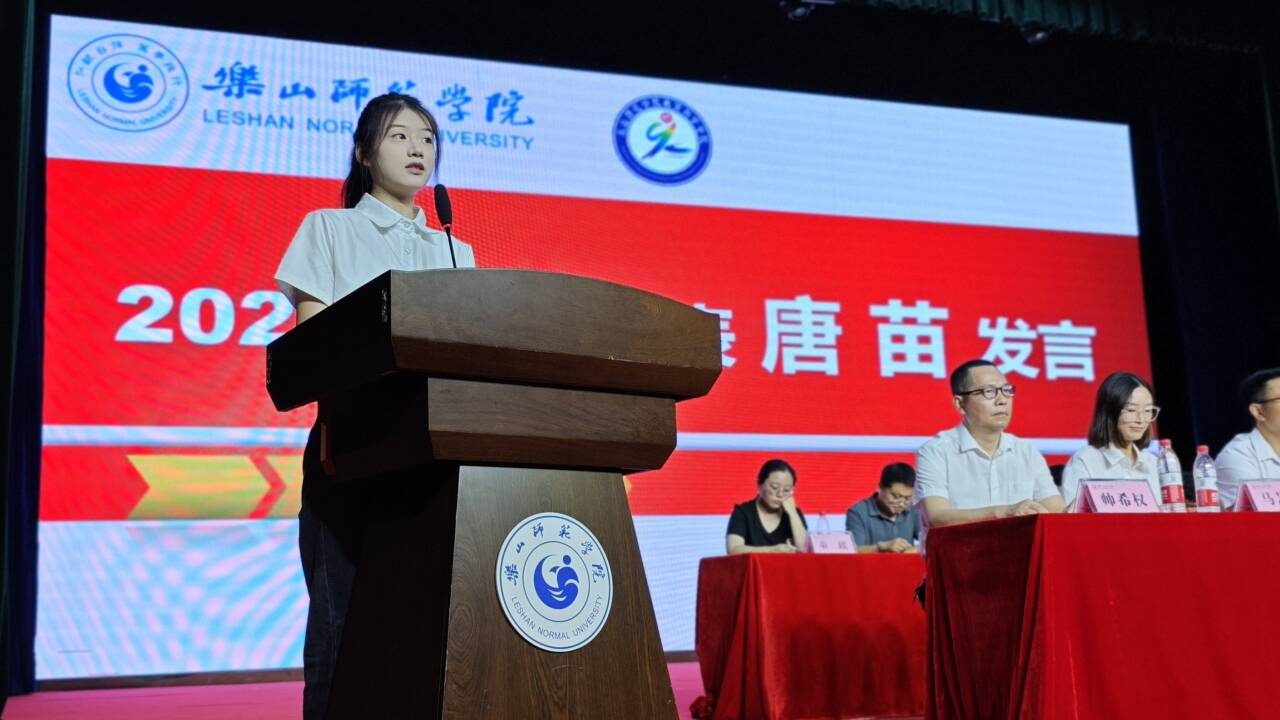之后的议程是校友代表发言,学院邀请到2018级学前教育专业优秀校友范雪,2020级科学教育专业优秀校友贾子淇。范雪在演讲时分享了自己的大学学习经验,她谈到,“且将新火试新茶,诗酒趁年华”,她鼓励同学们在大学期间要挥洒汗水、拼搏青春,积极参加各种竞赛活动,希望大家要勇于担当、敢于创新,珍惜大学时光,不负韶华!贾子淇分享了她在大学期间如何一步一步取得各类证书和奖学金的经验以及这一路走来的心路历程,她坚持不懈,心向阳光,是乐师学子们的优秀榜样。在演讲的最后,她鼓励同学们将学习与实践生活相结合,多尝试自己没有参与过的事物,找到自己的学习节奏,书写多彩青春!