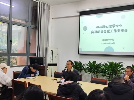 本网讯(文/陈小梅、图/陈小梅)为助力心理学专业学生平稳步入实习阶段,增强职业技能与专业素养,教育科学学院于12月19日上午10点10分,在学院会议室召开了2025届心理学专业实习动员会暨工作安排会。教育科学学院副院长唐前军教授、教务科长帅希权老师、教务秘书钟小婷老师、心理学专业负责人(本次实习带队教师)王立新教授、21级辅导员桂超老师及21级心理学专业全体同学参加此次会议,会议由桂超主持。