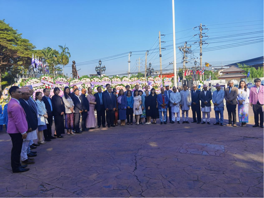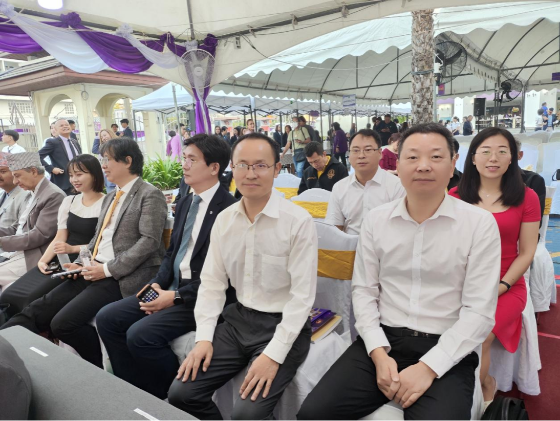 上午的校庆活动对班颂德大学而言,是一场非常隆重的学校文化项目,除了班颂德大学学校高层以外,皇室成员、政府领导、海外嘉宾等也都应邀参加了这次活动。在这场仪式感极强的大型活动中,我校佘万斌教授、唐前军教授应邀作为重要嘉宾,同其他来自十多个国家或地区的重要嘉宾一道参加了校庆中的敬献花篮活动。四位教师认真地参与了整个校庆活动的全过程,用心感受班颂德大学浓郁的校庆文化。我校参访团深入体验了泰国的校园文化和传统礼仪,还通过与其他国家和地区嘉宾的互动,增进了彼此的了解与友谊。这种文化交流为未来的国际合作营造了良好的氛围,也为两校在更多领域的合作提供了可能性。