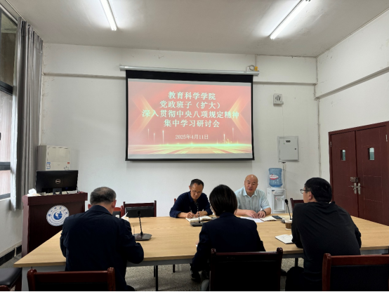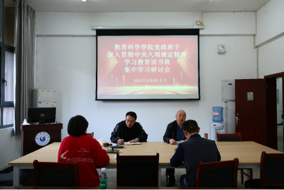 本网讯(图、文/童瑶)4月9日到11日,教育科学学院党委在学院会议室举行党政班子深入贯彻中央八项规定精神学习教育读书班研讨会。受党委书记罗立顺同志的委托,研讨会由党委副书记兼纪委书记何晓军主持。