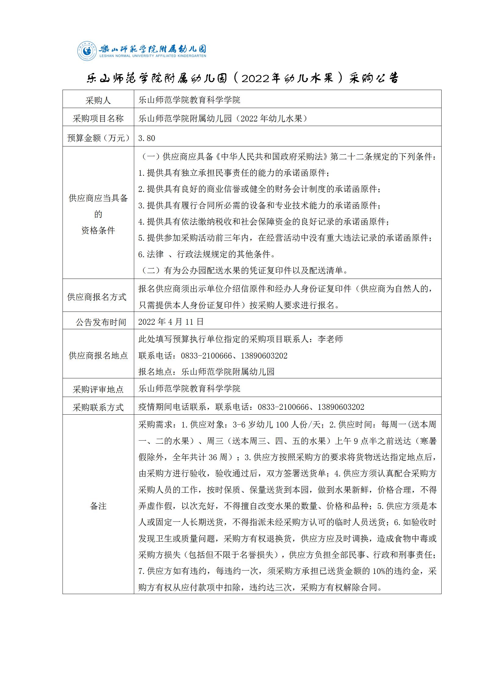 乐山师范学院附属幼儿园(2022年幼儿水果)采购公告